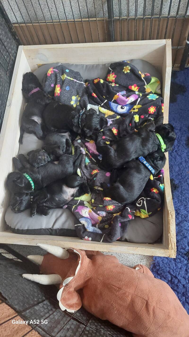 Heute hatten die Welpen den 2. Tag Brei. Die Zufütterung klappt prima. Danach kam dann ein sehr langer Mittagsschlaf (siehe Foto)🤗😂